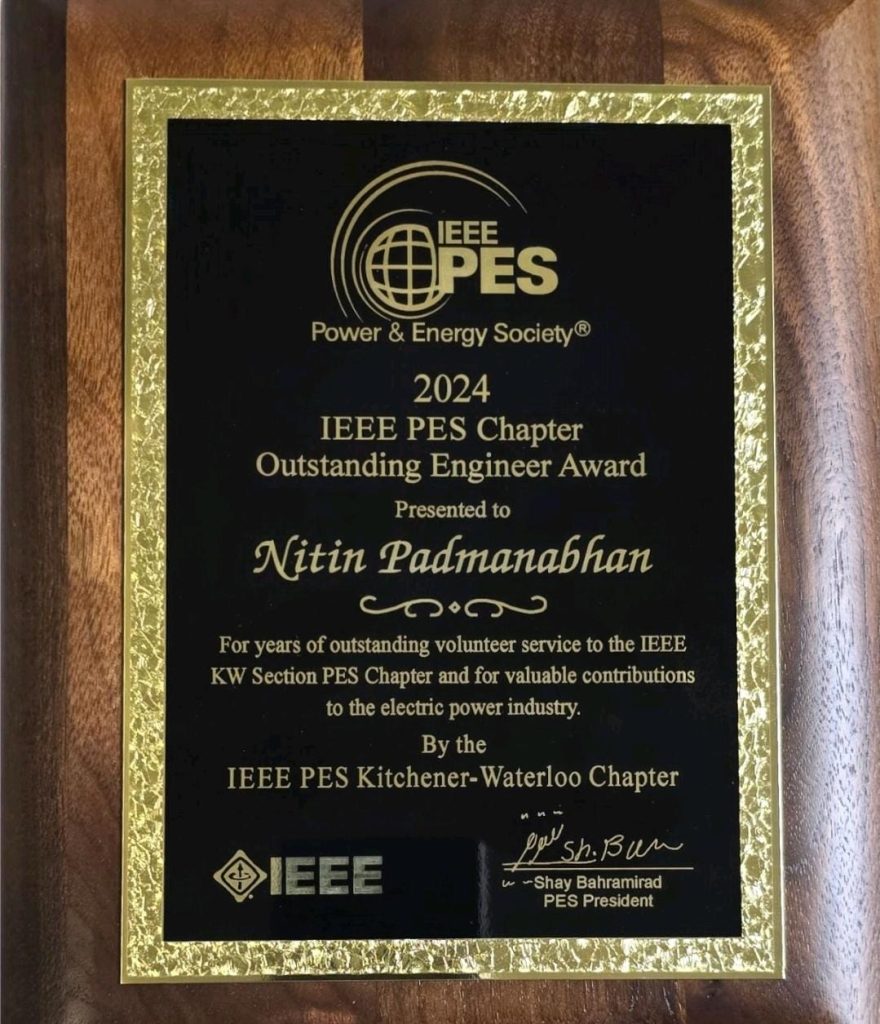 In recognition of his exceptional volunteer service and impactful contributions to the electric power industry, Nitin Padmanabhan has been awarded the 2024 IEEE PES Chapter Outstanding Engineer Award by the IEEE Power & Energy Society (PES) Kitchener-Waterloo Chapter.