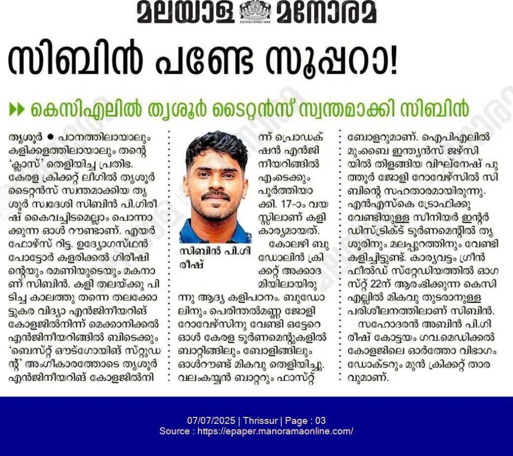 The KCL will feature several star players, and Sibin is expected to make a significant mark with his skills. Thrissur cricket fans are eagerly waiting to see their hometown player shine on the big stage.