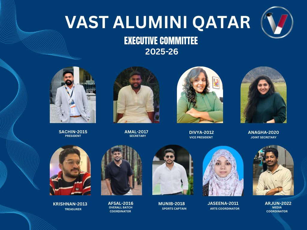 VAST Alumni Qatar is proud to introduce the Executive Committee for the term 2025–2026. This dynamic team of alumni leaders brings together experience, dedication, and a shared vision to strengthen alumni engagement, foster meaningful connections, and organize impactful academic, cultural, and social initiatives for the VAST community in Qatar.